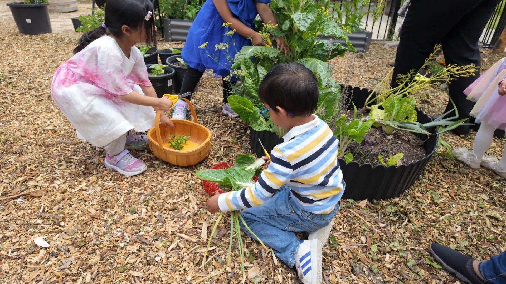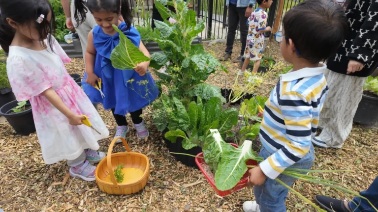 The excitement of picking ripe vegetables and herbs is a highlight — celebrating the fruits of their labor as a group.